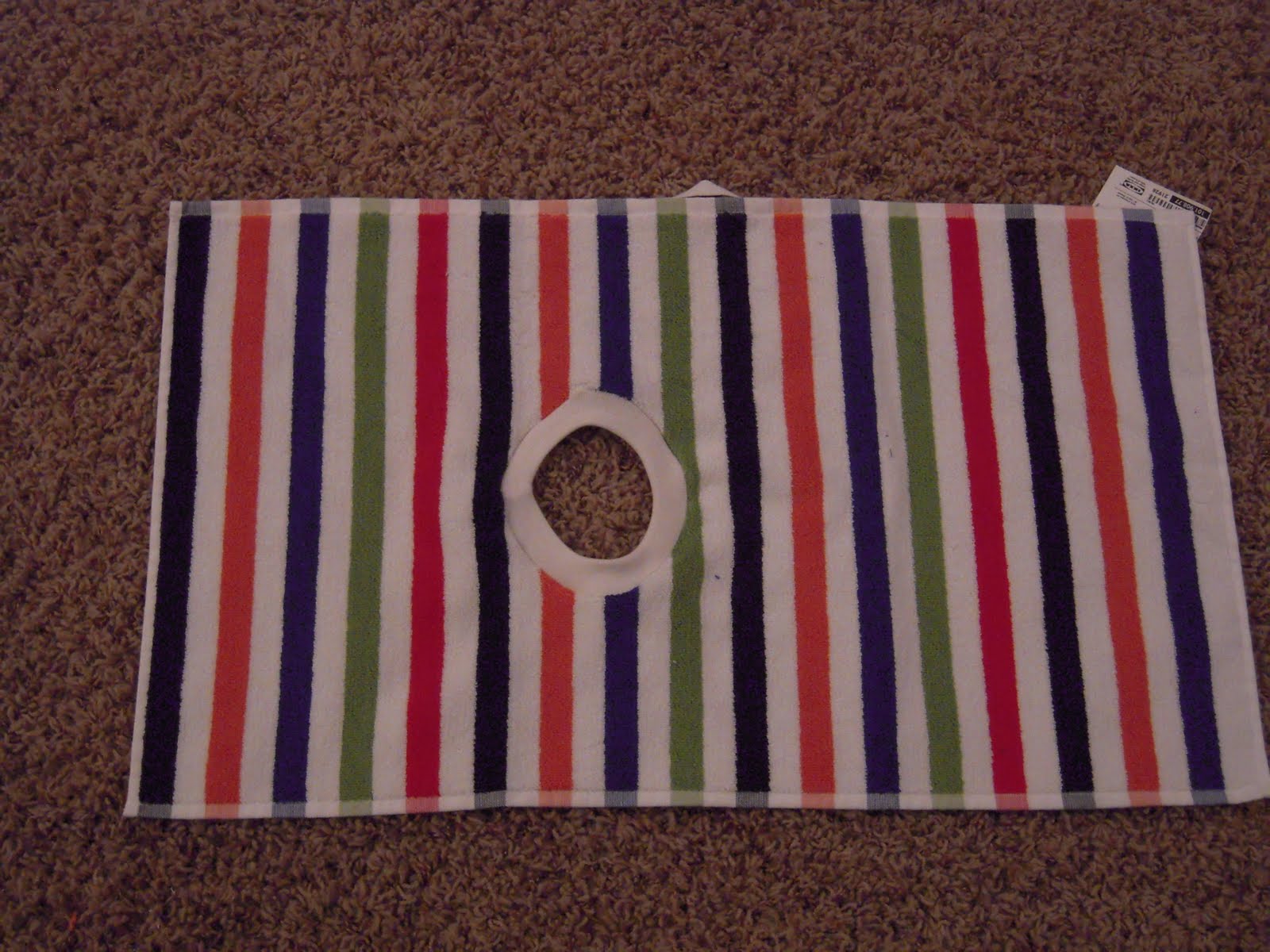 Fold your towel in half and cut a small circle. Cut it small, a little at a time, constantly trying it on your baby. You DO NOT want to cut it too big, otherwise it won't work with your ribbing and won't fit as well. Cut a little, try it on, cut a little, try it on, until it just barely fits over your baby's head. If your baby is anything like mine, they will absolutely DETEST this process, and try to crawl away from you as fast as possible when they see you with that striped towel.